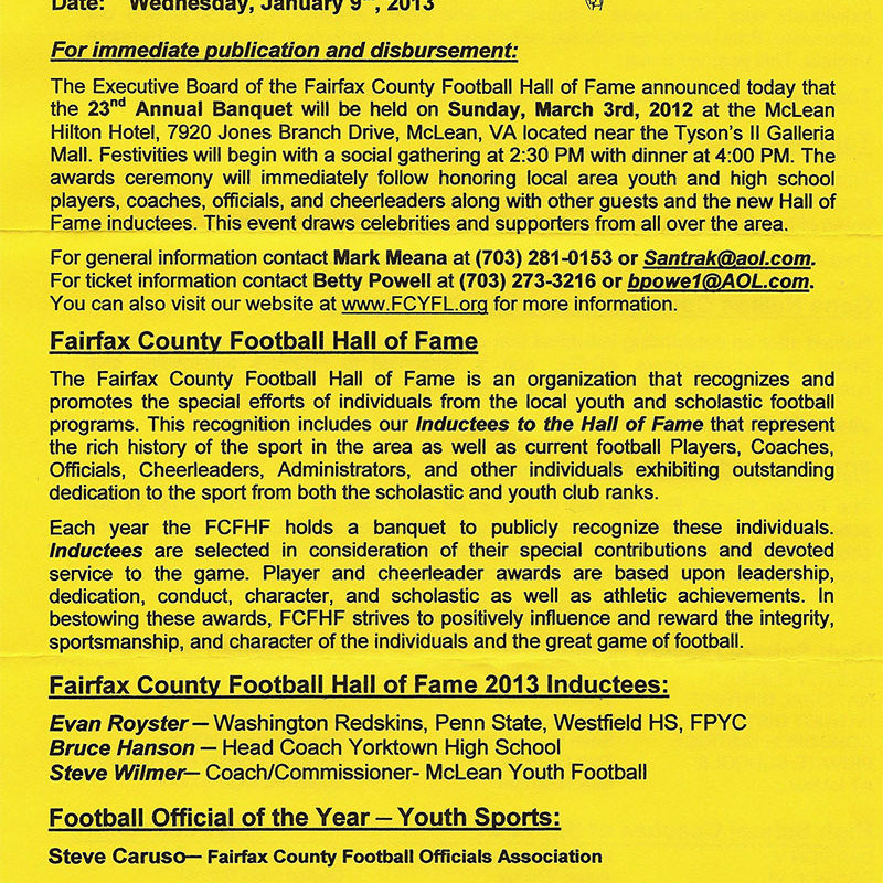 Following the outreach program, he began to coach youth football in McLean, which is part of the Fairfax County Youth Football League. He was a head coach for 20 years, and commissioner for four years. Combining the two programs, he has easily logged more than 30,000 hours as a volunteer. In 2013, he was inducted into the Northern Virginia Football Hall of Fame.